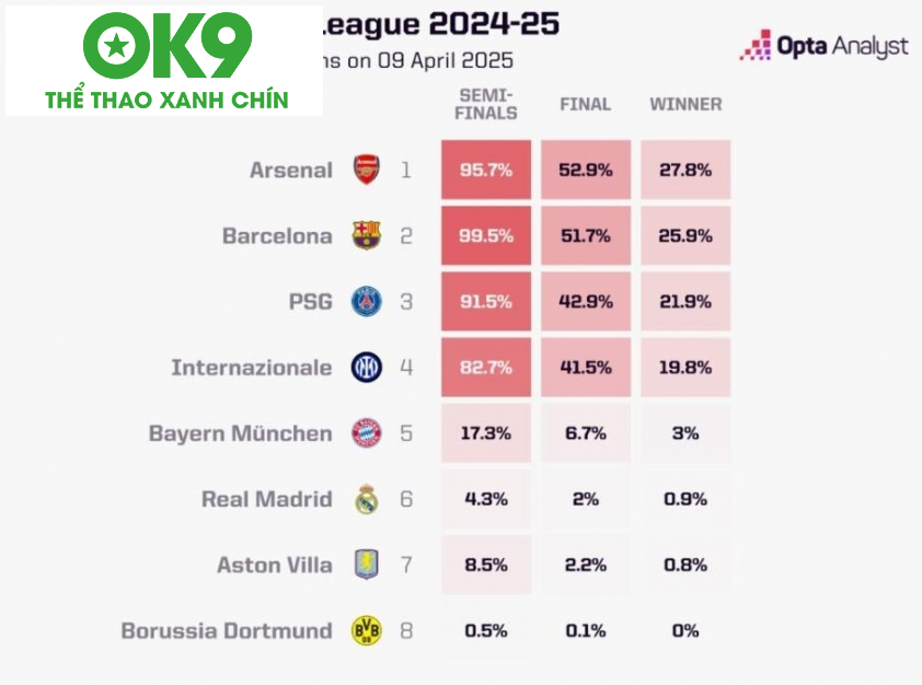 Sau lượt đi vòng tứ kết Champions League 2024/25, cục diện bắt đầu hé lộ với những lợi thế nhất định cho các đội bóng lớn như Barcelona, Arsenal và PSG. Tuy nhiên, điều gây ngạc nhiên cho giới mộ điệu là dự đoán từ siêu máy tính Opta: Arsenal mới là đội bóng có khả năng vô địch cao nhất, bỏ qua Barcelona – đội vừa có chiến thắng hủy diệt 4-0 trước Dortmund.